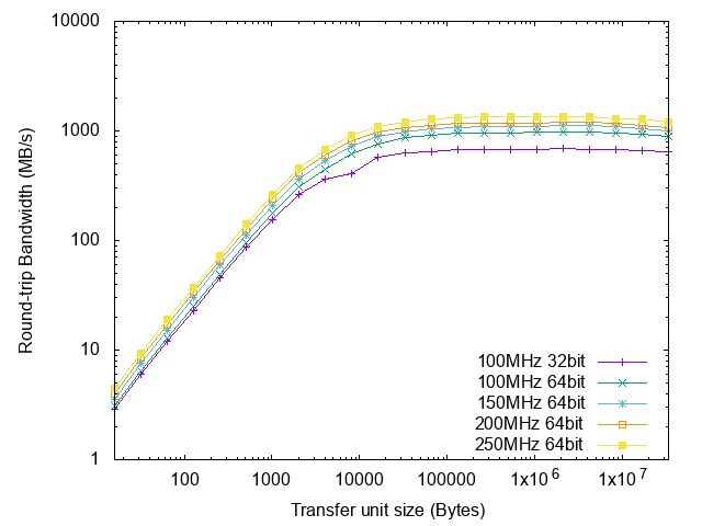 この図は以下のようなコードを用いて、Ultra96 (無印) で測定を行ったものです。往復のバンド幅ですから、片方向の場合はグラフの縦軸の値を2で割ることになります。ピークのバンド幅はおおよそ、